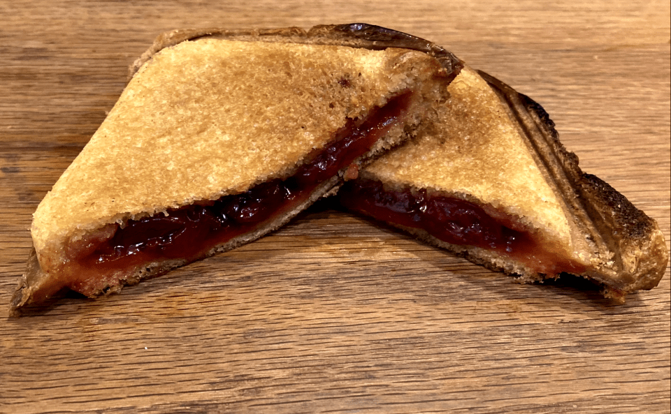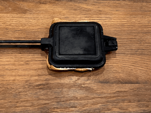 Close the iron by connecting its two halves and latch the iron using its hook; latching your iron will not only keep the iron together, but it will also apply pressure to the perimeter of your pie, which seals the filling inside. Don’t worry if the bread crust extends beyond the iron, you can cut the crust off with a bread knife before roasting if your prefer; you could still cut the crust off after roasting if it has burned.