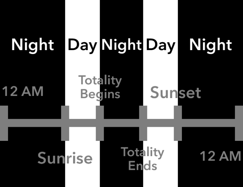 As you can see, most days begin at midnight with a nighttime, then they experience a daytime, followed by another nighttime, but April 8 began with a nighttime, followed by a daytime that ended at totality, which brought another nighttime, which faded into another daytime, which finally led to yet another nighttime; that makes 3 nights and 2 days all within 24 hours.