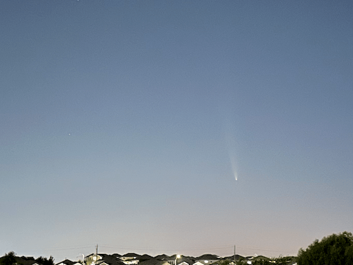 Staring at C/2023 A3 and its long tail made me start to wonder how long a comet’s tail really is. I compared the nearly full moon to my hand at arm’s length and found that its apparent diameter was about the width of my pinky fingernail, which I calculated to be about 0.6º. I then held my hand beside the comet and found that its apparent tail length was about half the length of my index finger, which I calculated to be around 4.7º; that’s quite impressive, especially considering that the comet was 189 times further away from the Earth than the Moon was.