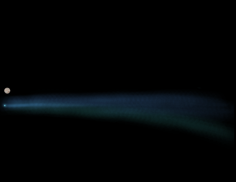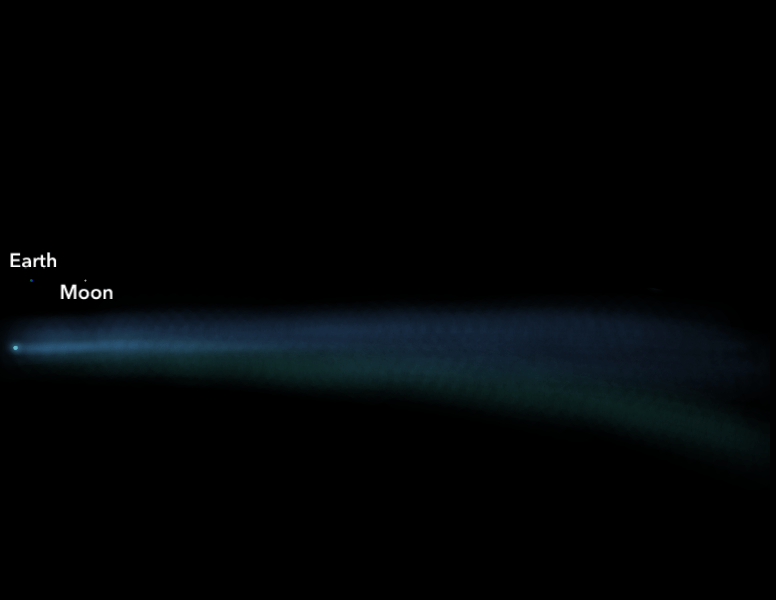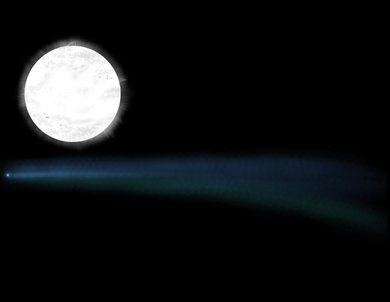 When a comet is at or near its perihelion, which is the closest point in its orbit to the Sun, the Sun’s intense heat vaporizes the comet’s icy surface, causing it to jet away from the comet. These jets launch the comet’s vaporized surface, which is now a mixture of gas and dust, into a long line that points away from the Sun; this line of gas and dust is what we see as a comet’s tail. The gas and dust particles in a comet’s tail are minute, in fact, they are not any bigger than smoke particles.